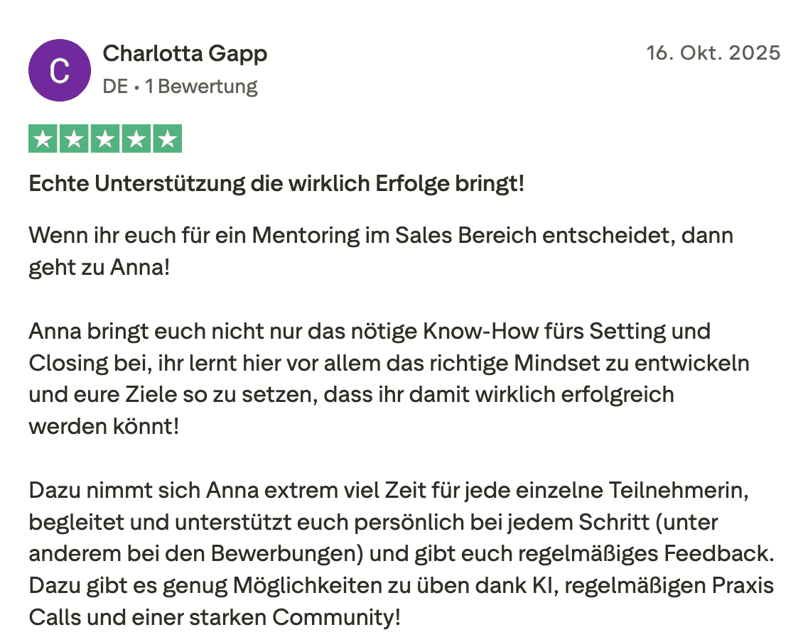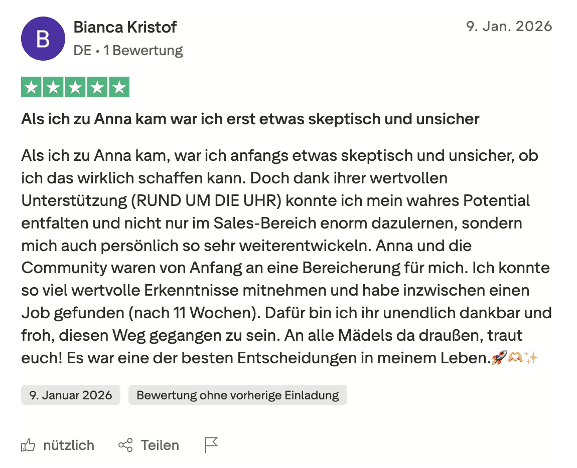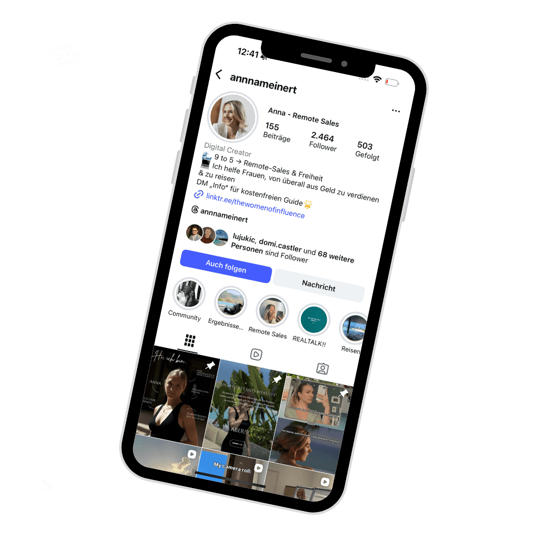 2x pro Woche gebe ich dir kostenfreien Mehrwert zum Thema Sales, Mindset und Weiblichkeit und zeige dir, wie das Leben im Remote Sales wirklich aussieht.